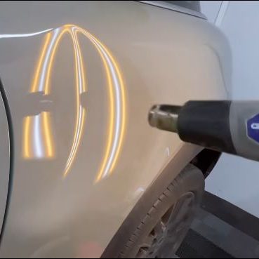 #2"The panel is warmed with a heat gun to make the metal and paint more malleable, which reduces the risk of finish cracking and ensures the area is at the optimal temperature for a successful paintless repair."