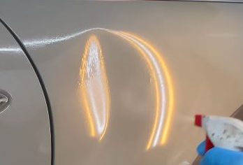 #1 "The damaged area is deep cleaned to remove road grime and oils, ensuring maximum adhesion for hot and cold glues while allowing for a thorough inspection of the finish; any detected cracks or paint failure would require reassessing the approach to a push-only repair from the inside to avoid further damage."