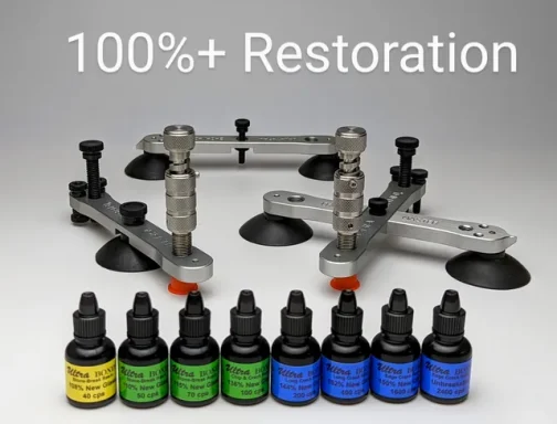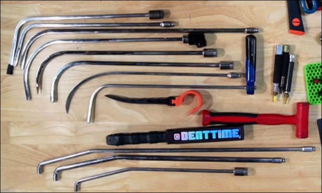 Left to right - PDR rods, only need a few until you need the one you don't have - large dent spreader - Hot glue tab pullers, hundreds of designs - Chip repair resin applicator, does two things 1-vacumes out air, 2- forceses the resin into the damaged area - Crack flexer pushes the crack open from the inside to help the resin flow into the repair on the outside.